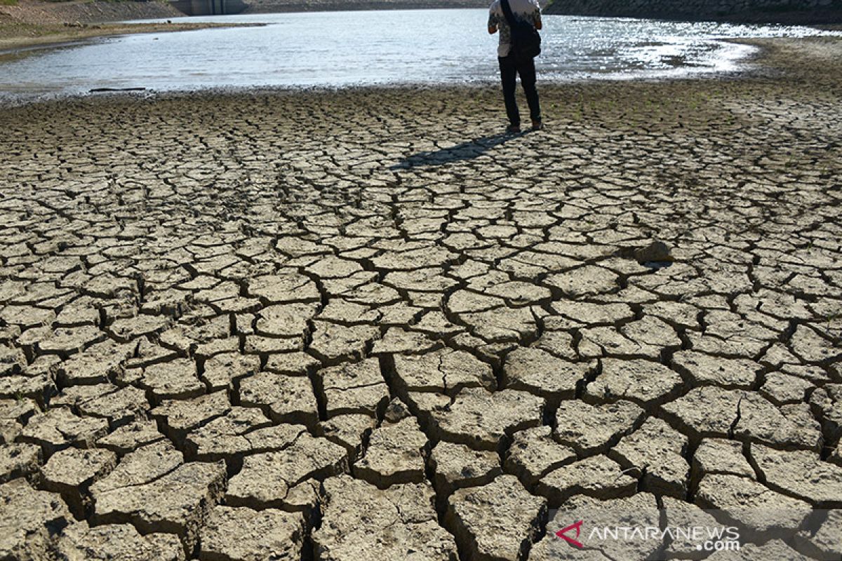 Warga menyasikan kondisi embung mengalami kekeringan seusai melaksanakan Shalat Istisqa di desa Lambadeuk, Kecamatan Peukan Bada, Kabupaten Aceh Besar, Aceh, Kamis (23/1/2020). Bupati Aceh Besar, Mawardi Ali menyatakan salah satu penyebab terjadinya kekeringan pada embung, waduk dan sungai pada musim kemarau yang berdampak terhadap seluas 2.400 hektare tanaman padi tercancam gagal panen dan distribusi air bersih terhenti di daerah itu akibat pembalakan liar. Antara Aceh/Ampelsa