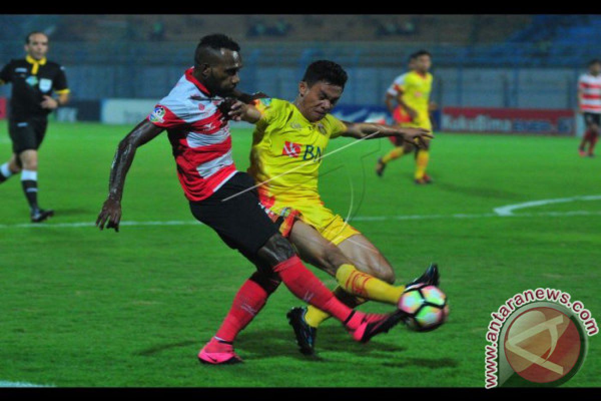 1Pesepak bola Madura United FC (MUFC) Engelberd sani (kiri) berebut bola dengan pesepak bola Bhayangkara FC, Aslan Sanda (kanan) dalam laga Gojek Traveloka Liga 1 di Stadion Gelora Bangkalan (SGB) Bangkalan, Jawa Timur, Rabu (8/11). Bhayangkara FC menang dengan skor 3-1 atas tuan rumah Madura FC. Antara Foto/Saiful Bahri/nym/2017.