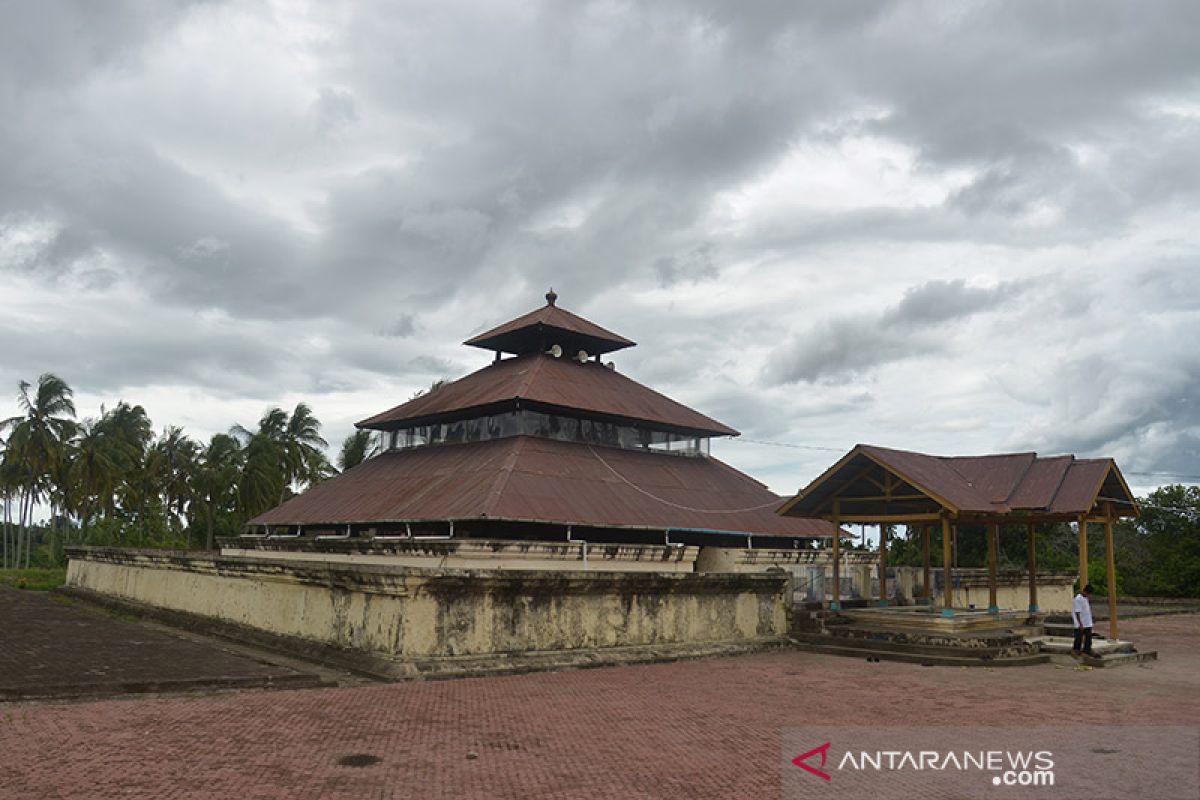 Warga berjalan menuju halaman masjid seusai Shalat Zuhur di Masjid Indrapuri, salah satu masjid tertua di Desa Indra Puri, Kabupaten Aceh Besar, Aceh, Sabtu (2/5/2020). Masjid Indrapuri sebagai situs sejarah dibangun pada masa kerajaan Sultan Iskandar Muda abad ke-16 di atas lahan bekas candi kerajaan Hindu Lamuri menggunakan arsitekur Aceh Kuno dan kontruksi kayu yang hingga saat ini masih berdiri kokoh dan ramai umat muslim beribadah di bulan ramadhan. Antara Aceh/Ampelsa