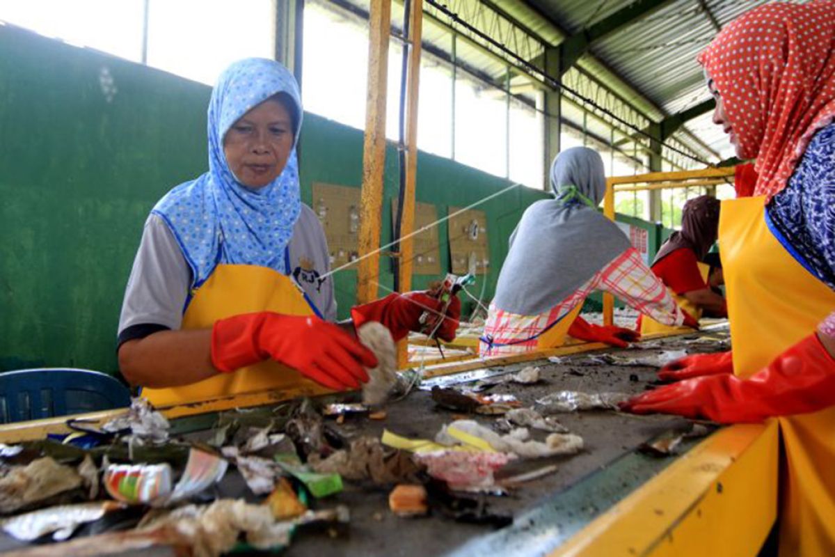 Pekerja memilah sampah plastik di Tembokrejo, Muncar, Banyuwangi, Jawa Timur, Kamis (4/4/2019). Pengelolaan sampah yang diberi nama program STOP tersebut, mampu mengolah sampah sebanyak tiga ton sampah laut per hari, yang terdiri dari 75 persen sampah organik, 13 persen plastik, 12 persen logam, beling, sisanya sampah "sanitary" seperti popok dan pembalut. ANTARA FOTO/Budi Candra Setya/nym.