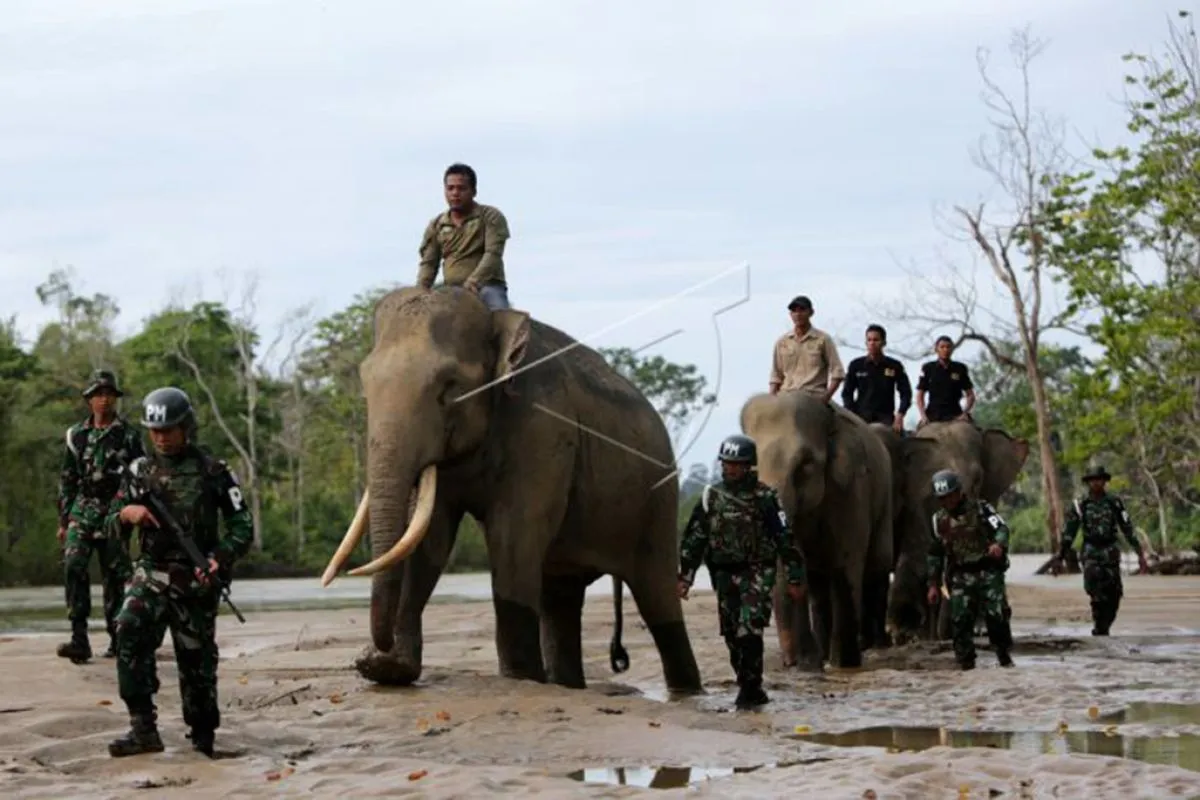 Anggota Polisi Militer (PM) Kodam Iskandar Muda bersama aktivis lingkungan dan tim Conservation Response Unit (Unit) Sampoiniet dibantu gajah jinak melaksanakan operasi penegakkan ketertiban (Gaktib) di kawasan hutan Ulue Masen, Aceh Jaya, Sabtu (27/4/2019). Operasi gabungan yang melibatkan aparat TNI dan Balai Konservasi Sumber Daya Alam (BKSDA) Aceh itu untuk menjaga kelestarian alam dan satwa liar dari ancaman kepunahan. ANTARA FOTO/Irwansyah Putra/nym.