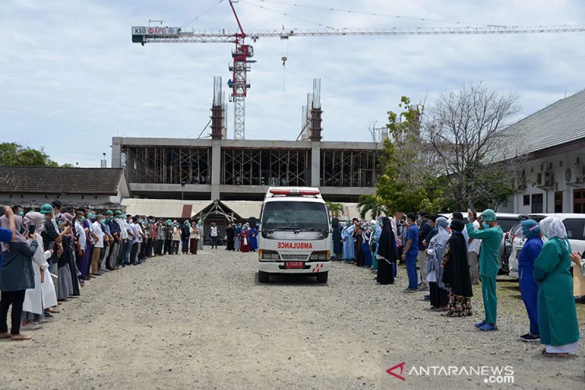 Ratusan tenaga medis membacakan shalawat saat melepas pemberangkatan jenazah dokter anestesi posif COVID-19 menggunakan mobil ambulan di Rumah Sakit Umum Zainal Abidin, Banda Aceh, Aceh, Rabu (2/9/2020). Direktur Rumah Sakit Zainal Abidin, Dokter Azharuddin menyatakan, jenazah Imai Indra SP.AN merupakan dokter pertama yang meninggal akibat COVID-19 itu dimakamkan di rumah duka di salah satu desa dalam wilayah kabupaten Aceh Besar, sementara seratus lebih tenaga medis lainnya yang juga positif COVID-19 saat ini tengah menjalani perawatan. Antara Aceh/Ampelsa.