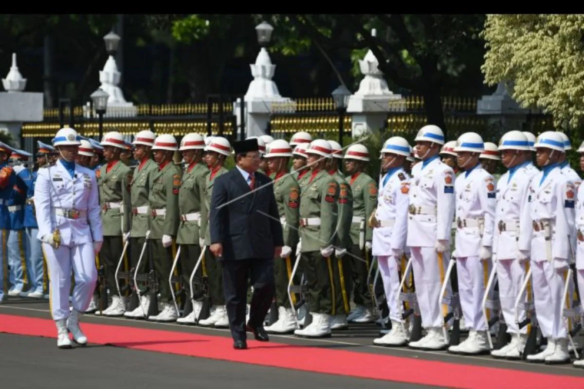Menteri Pertahanan Prabowo Subianto (kedua kiri) menginspeksi pasukan saat upacara penyambutan di Kantor Kementerian Pertahanan, Jakarta, Kamis (24/10/2019). ANTARA FOTO/M Risyal Hidayat/nym