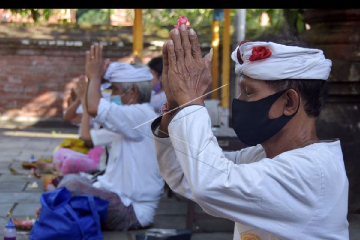 Umat Hindu melakukan persembahyangan Hari Tumpek Wayang dengan mengikuti protokol kesehatan di Pura Dalem Kahyangan Badung, Denpasar, Bali, Sabtu (13/6/2020). Persembahyangan tersebut untuk memohon agar wabah COVID-19 cepat berakhir menyusul adanya peningkatan kasus penularan secara transmisi lokal di Bali. ANTARA FOTO/Nyoman Hendra Wibowo/nym.
