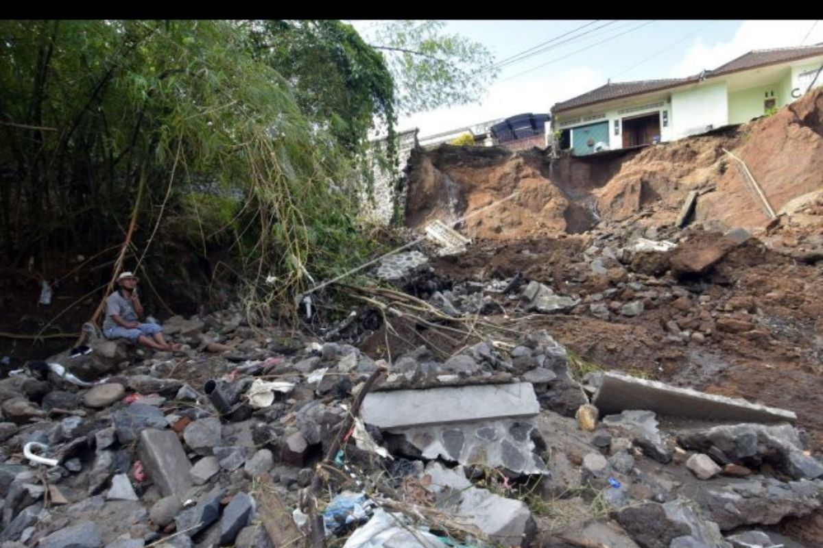 Warga melihat kondisi jalan yang putus akibat cuaca ekstrem yang terjadi di Lingkungan Sanggulan, Desa Banjar Anyar, Tabanan, Minggu (11/10/2020). Badan Penanggulangan Bencana Daerah (BPBD) Kabupaten Tabanan mendata ada 58 titik kejadian bencana akibat hujan deras yang mengguyur wilayah itu pada Sabtu (10/10/2020) dengan total kerugian mencapai sekitar miliaran rupiah, korban terluka satu orang dan nihil korban jiwa. ANTARA FOTO/Nyoman Hendra Wibowo/nym.