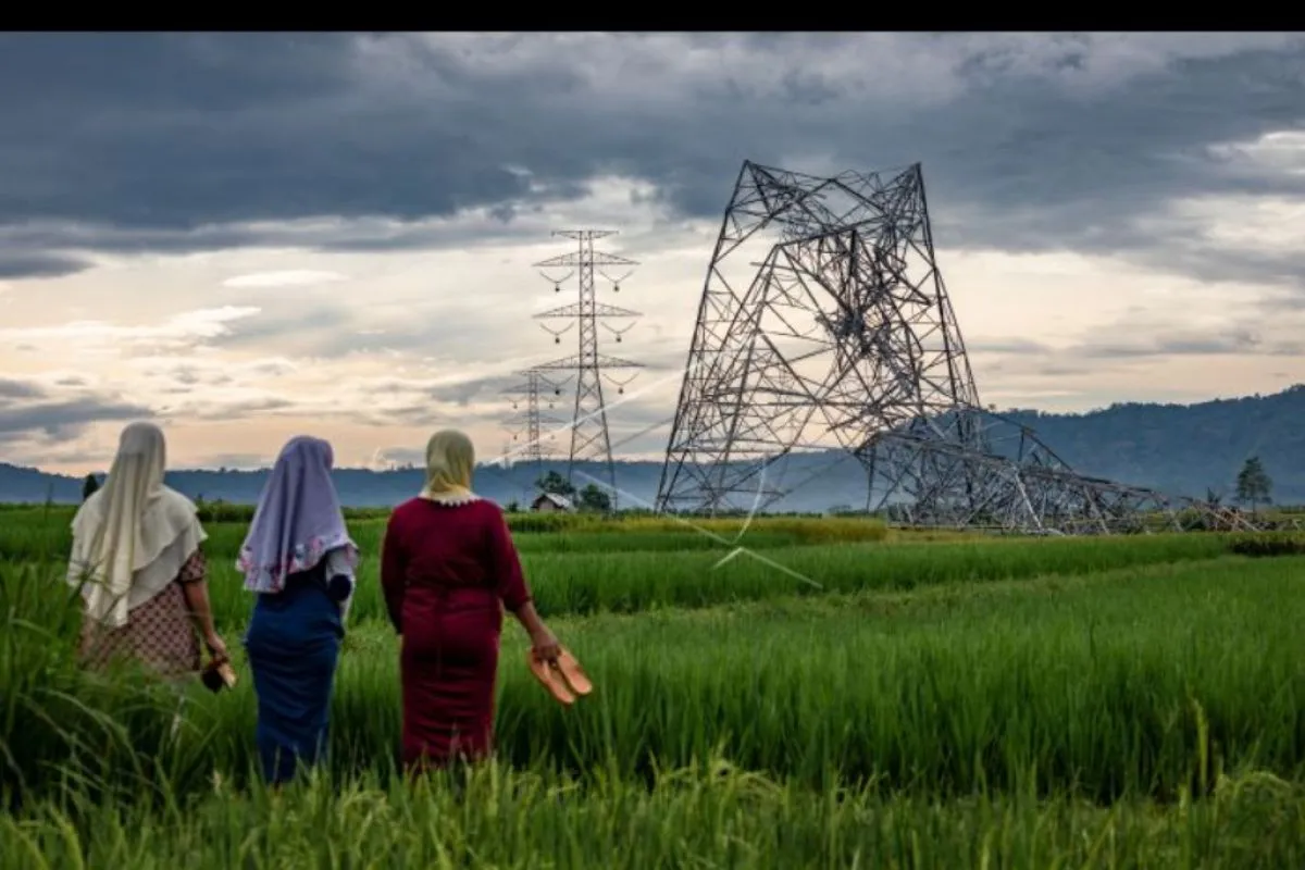 Sejumlah petani melihat menara Saluran Udara Tegangan Ekstra Tinggi (SUTET) 136 transmisi 500 KV jaringan Batang-Ungaran milik PT PLN (Persero) yang roboh di area persawahan Desa Kebumen, Tersono, Batang, Jawa Tengah, Senin (2/11/2020). Menara SUTET yang masih dalam tahap pengerjaan penarikan kabel jaringan transmisi itu roboh pada Minggu (1/11) kemarin yang menyebabkan satu petani luka ringan dan satu lagi trauma. Sementara itu pihak kontraktor bersama kepolisian masih menyelidiki peristiwa tersebut. ANTARA FOTO/Aji Styawan/nym.