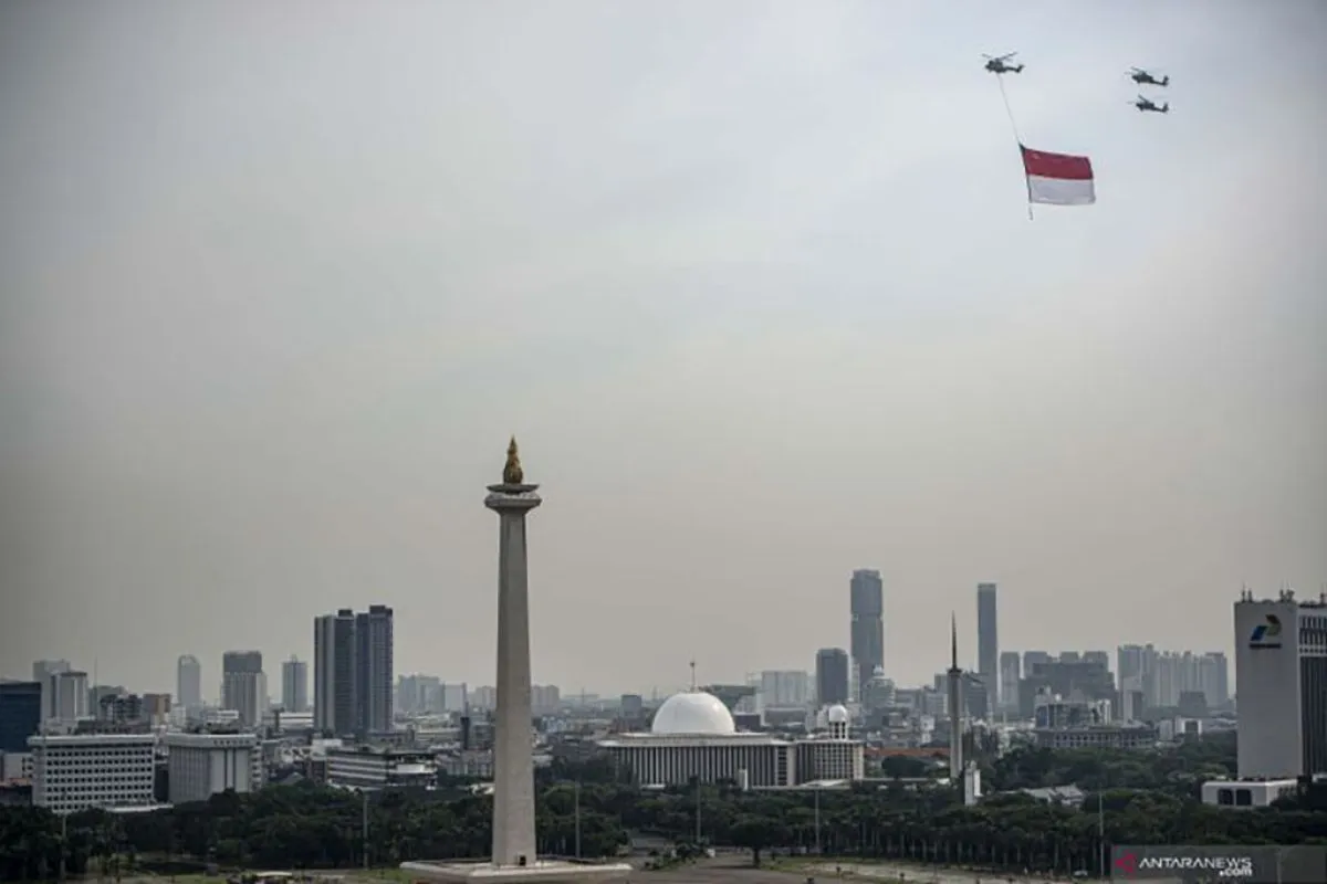 Helikopter TNI terbang dengan mengibarkan bendera Merah Putih dalam rangka peringatan HUT Ke-76 TNI di atas kawasan Monas, Jakarta, Selasa (5/10/2021). Sebanyak delapan helikopter TNI (AD, AL, AU) dengan call sign "Trimatra Flight" terbang melintasi langit Jakarta dengan membawa bendera Merah Putih dan bendera Lambang TNI yang berukuran 20x30 meter, serta 18 pesawat tempur TNI AU melaksanakan terbang formasi "arrow head" dan manuver "bomb burst". ANTARA FOTO/Aprillio Akbar/nym.