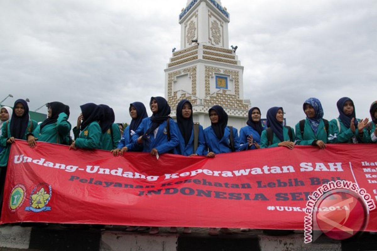 Seratusan mahasiswa dari berbagai perguruan tinggi di Aceh yang tergabung dalam Persatuan Perawat Indonesia (PPNI) Aceh menggelar aksi di bundaran Simpang Lima, Banda Aceh, Kamis (25/9). Mahasiswa keperawatan menuntut DPR RI dan pemerintah mensahkan Rancangan Undang-Undang (RUU) keperawatan menjadi undang-undang keperawatan. ANTARAACEH.COM/Ampelsa/14