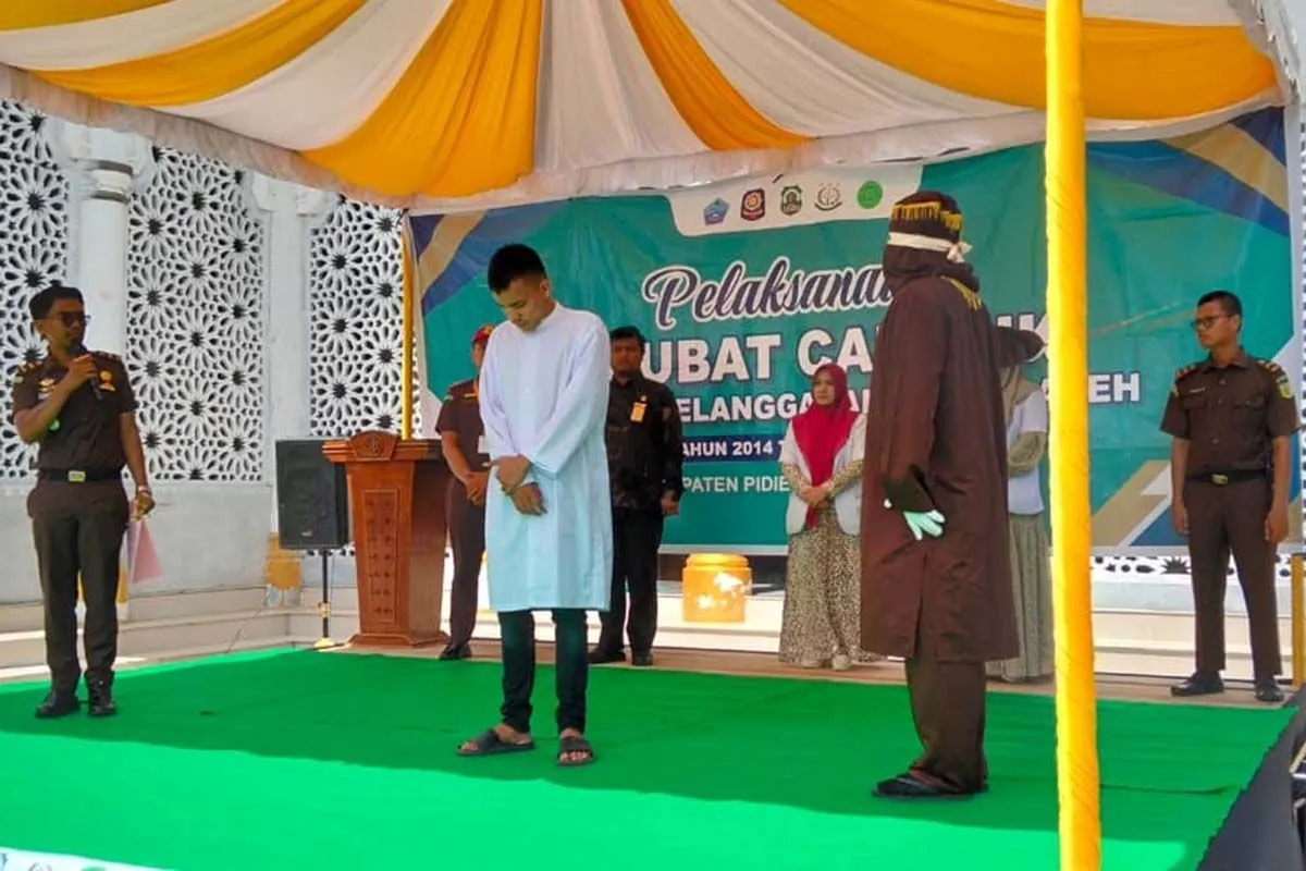 Pelaksanaan hukuman cambuk berlangsung di hadapan khalayak ramai di Halaman Masjid Agung Tgk Chik Pante Geulima, Meureudu, ibu kota Kabupaten Pidie Jaya, Kamis.