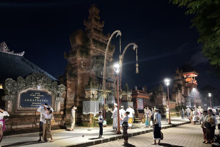 Denpasar (ANTARA) - Umat Hindu di Bali masih meramaikan Pura Agung Jagatnatha Denpasar hingga malam hari dalam rangka persembahyangan Hari Raya Galungan.