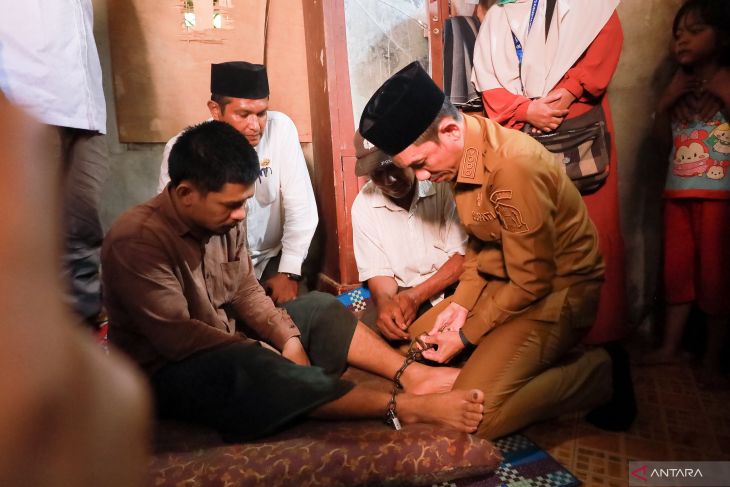 Bupati Aceh Barat Tarmizi membebaskan seorang warga Desa Gunong Kleng, Kecamatan Meureubo, Kabupaten Aceh Barat yang mengalami gangguan dari rantai pasung, Jumat (2/5/2025). (ANTARA/HO-Dok. Pemkab Aceh Barat)
