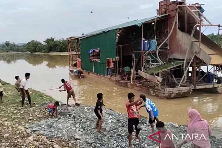 Dokumentasi - Warga dan anak-anak melakukan aksi pelemparan batu ke sebuah kapal pengeruk emas milik PT Magellanic Garuda Kencana di kawasan Desa Gleng, Kecamatan Sungai Mas, Kabupaten Aceh Barat, Sabtu (4/10/2025). (ANTARA/HO-Dok. Pribadi)