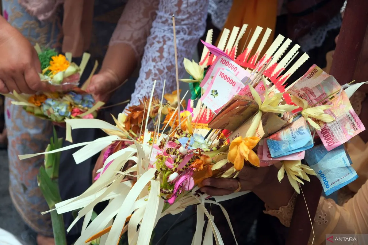 Seorang warga menyiapkan sarana upacara yang berisi uang saat tradisi Mesuryak pada perayaan Hari Raya Kuningan di Desa Bongan Gede, Tabanan, Bali, Sabtu (29/11/2025). Tradisi berebut uang yang digelar setiap Hari Raya Kuningan tersebut bertujuan mengantarkan roh para leluhur kembali ke surga dengan rasa suka cita serta bermakna sebagai rasa syukur sekaligus mempererat kebersamaan keluarga dan masyarakat. ANTARA FOTO/Nyoman Hendra Wibowo/wsj.
