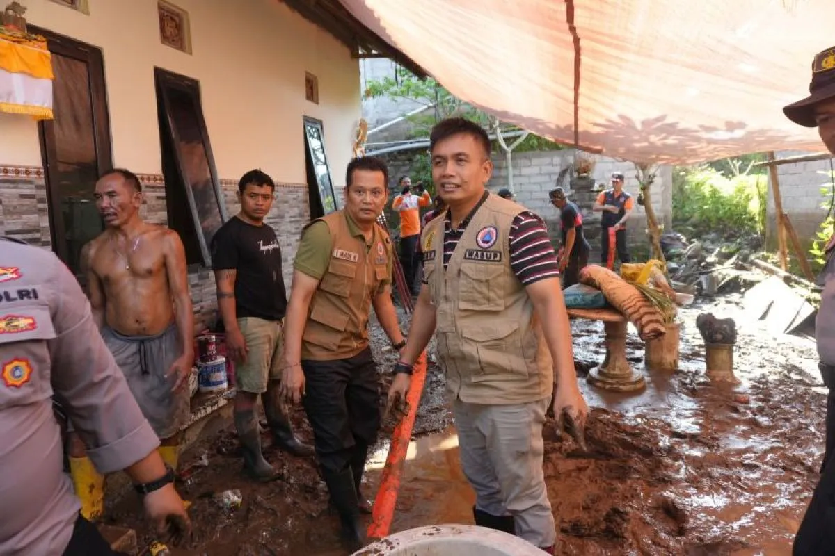 Bupati Jembrana ikut bergotong-royong membersihkan rumah warga dari sisa material banjir di perkampungan Banjar Pasar di desa setempat.
