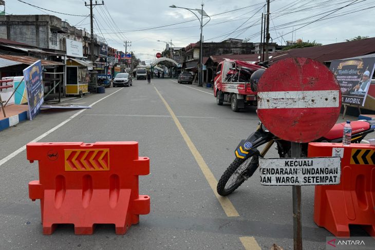 Akses ruas Jalan Manekroo, Meulaboh, Kabupaten Aceh Barat terpaksa ditutup bagi aktivitas publik karena akan digelar aktivitas sebuah kelompok pengajian, Minggu (23/11/2025). (ANTARA/Teuku Dedi Iskandar).