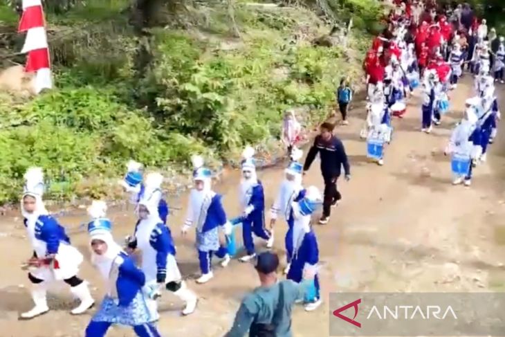 Penampilan drumband SDN 1 Blang Nisam saat jalan sehat gembira pada peringatan HUT RI pada Agustus 2025 di Kecamatan Indra Makmu, Kabupaten Aceh Timur. (ANTARA/HO)