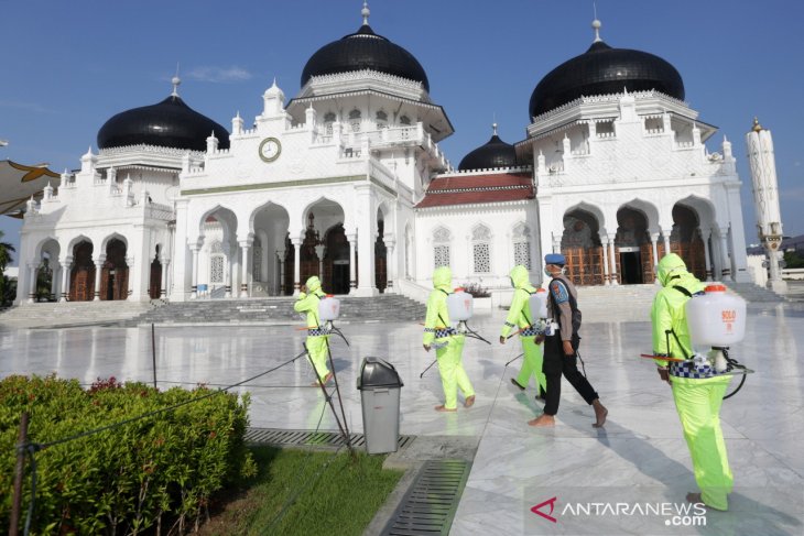 Personil kepolisian Polda Aceh dari jajaran Polresta Banda Aceh, Satuan Brimob dan Bid Dokkes melakukan penyemprotan cairan desinfektan di Masjid Raya Baiturrahman, Banda Aceh, Aceh, Jumat (20/3/2020). Penyemprotan disinfektan yang dilakukan sebelum pelaksanaan ibadah salat jumat itu guna mencegah penularan virus Corona 2019 (COVID-19). Antara Aceh/Irwansyah Putra.
