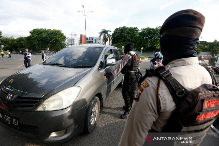 Personil Polresta Banda Aceh mengarahkan warga yang terjaring razia penggunaan masker yang dilakukan tim gabungan Pemerintah Kota Banda Aceh di Banda Aceh, Aceh, Kamis (28/5/2020). Tim gugus tugas percepatan penanganan COVID-19 Kota Banda Aceh menjaring dan mendata puluhan warga yang tidak memakai masker. Antara Aceh/Irwansyah Putra.