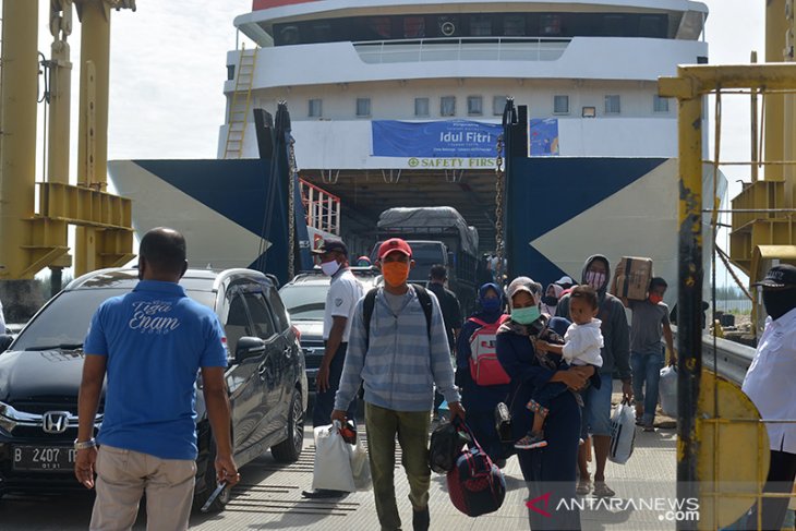 Penumpang dari Pulau Sabang turun dari kapal saat tiba di Pelabuhan Penyeberangan Ulee Lheue, Banda Aceh, Aceh, Sabtu (6/6/2020). Arus penumpang kapal dari dan ke Pulau Sabang-Banda Aceh kembali ramai setelah pemerintah Kota Sabang membuka jalur trasportasi ke daerah itu, namun tetap membatasi jumlah penumpang hanya 50 persen dari kapasitas kapal serta diwajibkan mengisi Form Surveilans Migrasi Pendataan COVID-19 sesuai dengan protokol kesehatan. Antara Aceh/Ampelsa.