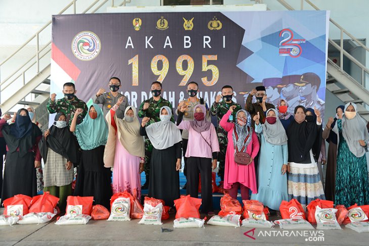 Komandan Pangkalan Udara (LANUD) Sultan Iskandar Muda, Kolonel Pnb Muhamad Satriyo Utomo (Tengah belakang) bersama perwira Polri dan pejabat pemerintah setempat dan warga pra sejahtera berfoto saat penyerahan sembako kepada warga prasejahterad di Lanud Blang Bintang, Kabupaten Aceh Besar, Aceh, Kamis (23/7/2020). Bakti sosial donor darah untuk memenuhi kebutuhan darah masyarakat di tengah pandemi COVID-19 dan penyaluran sembako kepada warga prasejahtera itu dalam rangka peringatan Hari Bakti TNI AU dan Pengabdian 25 tahun AKABRI 1995. Antara Aceh/Ampelsa.