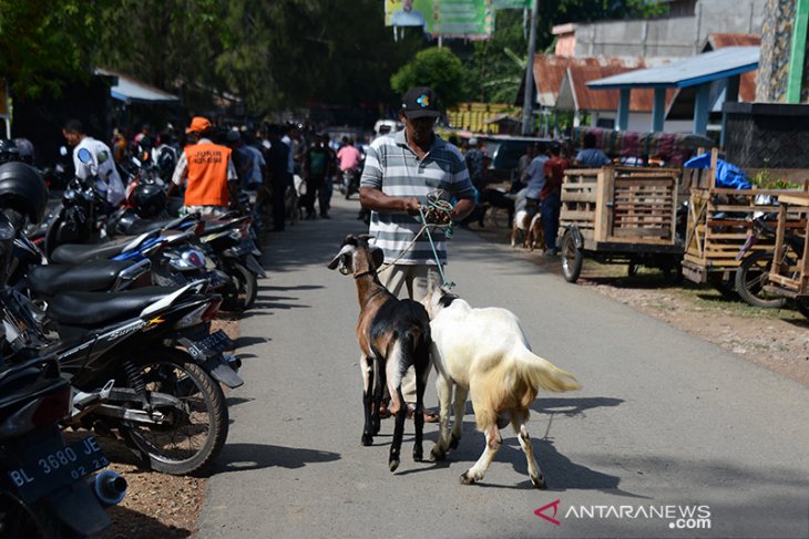 Warga terlibat transaksi jual beli kambing kurban di pasar hewan Cot Irie, Kabupaten Aceh Besar, Sabtu (25/7/2020). Pedagang menyatakan sejak pandemi COVID-19, transaksi penjualan hewan kurban, termasuk kambing dan domba sepi disertai harga penjualan ternak juga menurun hingga 20 persen dari Rp 2.000.000 menjadi Rp1.800.000 per ekor menurut ukurannya. Antara Aceh/Ampelsa.