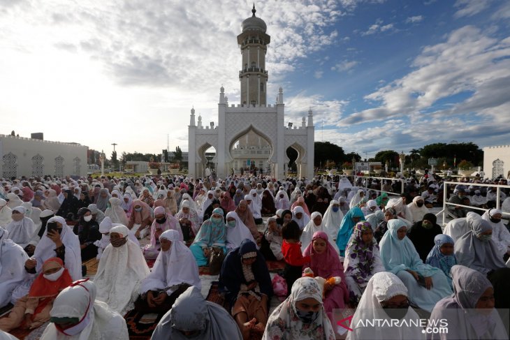 Umat muslim menunaikan ibadah Shalat Idul Adha 1441 H di Masjid Raya Baiturrahman, Banda Aceh, Aceh, Jumat (31/7/2020). Mayoritas umat muslim melaksanakan shalat Idul Adha secara berjamaah di tengah pandemi COVID-19. Antara Aceh/Irwansyah Putra.