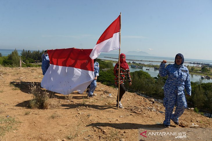 Anggota Kader Bela Negara, Srikandi Merah Putih dan Alumni Parade Cinta Tanah Air mengibarkan bendera merah putih di kawasan perbukitan Tempat Pemrosesan Akhir (TPA) sampah Banda Aceh, Minggu (16/8/2020). Pengibaran bendera merah putih dengan menerapkan protokol kesehatan di tengah pandemi COVID-19 di kawasan pesisir pantai itu dalam rangka menyambut perayaan HUT ke-75 RI. Antara Aceh/Ampelsa.