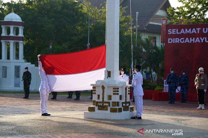 Penggerek bendera mengibarkan bendera merah putih diiringi lagu Indonesia Raya saat berlangsung upacara memperingati HUT ke 75 RI di Kantor Pemerintahan Aceh, Banda Aceh, Aceh, Senin (17/8/2020). Peringatan HUT ke75 RI di Aceh tetap berlangsung secara sederhana dengan jumlah peserta upacara terbatas hanya dihadiri oleh beberapa pejabat forkopimda Aceh tanpa tamu undangan dengan menerapkan protokol kesehatan guna mencegah pandemi COVID-19. Antara Aceh/Ampelsa.