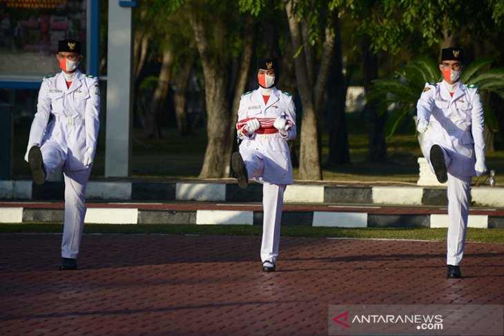 Pasukan pengibar bendera membawa bendera merah putih memasuki lapangan upacara saat memperingati HUT ke 75 RI di Kantor Pemerintahan Aceh, Banda Aceh, Aceh, Senin (17/8/2020). Peringatan HUT ke75 RI di Aceh tetap berlangsung secara sederhana dengan jumlah peserta upacara terbatas hanya dihadiri oleh beberapa pejabat forkopimda Aceh tanpa tamu undangan dengan menerapkan protokol kesehatan guna mencegah pandemi COVID-19. Antara Aceh/Ampelsa.