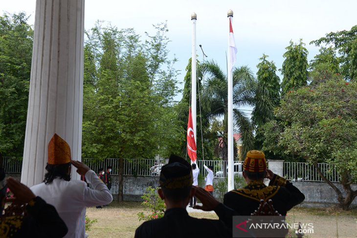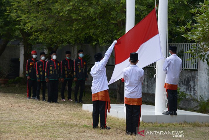 Keluarga pewaris Diaraja Kerajaan Aceh Darussalam mengibarkan bendera merah putih saat mengikuti upacara adat di Banda Aceh, Aceh, Kamis (20/8/2020). Upacara adat berlangsung sederhana di tengah pandemi COVID-19 yang dihadiri keluarga pewaris kerajaan dengan diawali pengibaran bendera merah putih dan kemudian bendera Alam Pedang Kerajaan Aceh Darussalam digelar setiap 1 Muharam itu sebagai simbul pemersatu dan penyemangat rakyat Aceh dan sekaligus melestarikan budaya nusantara dalam semangat NKRI. Antara Aceh/Ampelsa.