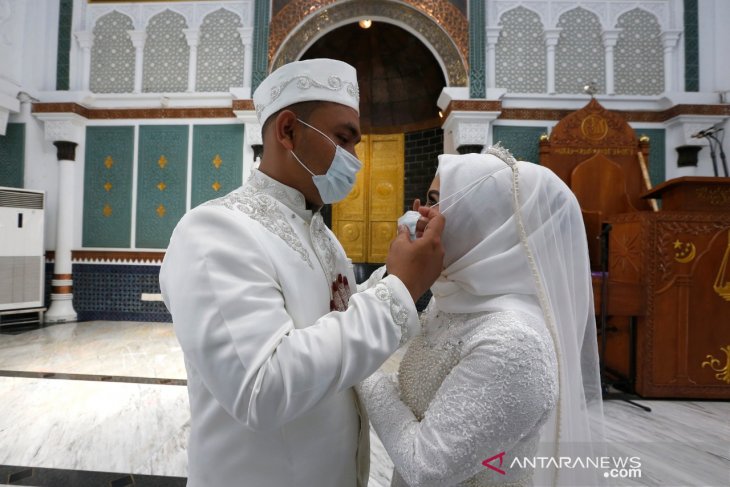 Pengantin pria membenahi masker pasangannya seusai ijab kabul pernikahan di Masjid Raya Baiturrahman, Banda Aceh, Aceh, Jumat (21/8/2020). Kementerian Agama Aceh kembali memberikan pelayanan kepada calon pasangan pengantin untuk melaksanakan prosesi pernikahan dluar KUA dengan tetap melaksanakan protokol kesehatan sebagai upaya mencegah penyebaran COVID-19. Antara Aceh/Irwansyah Putra.