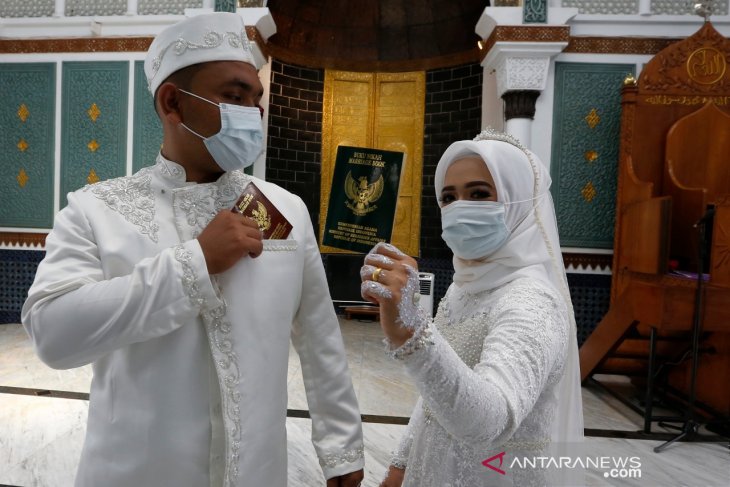 Calon pengantin pria (dua kanan) mengucapkan ijab kabul pernikahan yang berlangsung di Masjid Raya Baiturrahman, Banda Aceh, Aceh, Jumat (21/8/2020). Kementerian Agama Aceh kembali memberikan pelayanan kepada calon pasangan pengantin untuk melaksanakan prosesi pernikahan dluar KUA dengan tetap melaksanakan protokol kesehatan sebagai upaya mencegah penyebaran COVID-19. Antara Aceh/Irwansyah Putra.