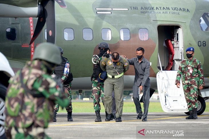 Prajurit TNI-AU mengamankan pilot besama pesawat asing yang melakukan pelanggaran wilayah udara Indonesia saat Latihan Antar Satuan Komando Operasi Angkatan Udara I Jalak Sakti di Lanud Sultan Iskandar Muda, Blang Bintang, Kabupaten Aceh Besar, Aceh, Selasa (8/9/2020). Latihan Antar Satuan Koopsai Jalak Sakti yang melibatkan dua pesawat F 16 dan Paskhas TNI AU itu dalam rangka meningkatkan sinergitas dan kemampuan prajurit dalam mengamankan wilayah udara NKRI dari ancaman musuh. Antara Aceh/Ampelsa.