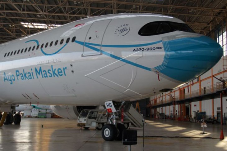 Pesawat Garuda Indonesia Airbus A330-900neo bercorak khusus yang menampilkan visual masker pada bagian moncong pesawat berada di Hanggar GMF AeroAsia Bandara Soekarno Hatta, Tangerang, Banten, Kamis (1/10/2020). Pemberian gambar masker pada pesawat merupakan dukungan Garuda Indonesia terhadap program edukasi pemerintah melalui kampanye 'Ayo Pakai Masker'. ANTARA FOTO/Muhammad Iqbal/aww.