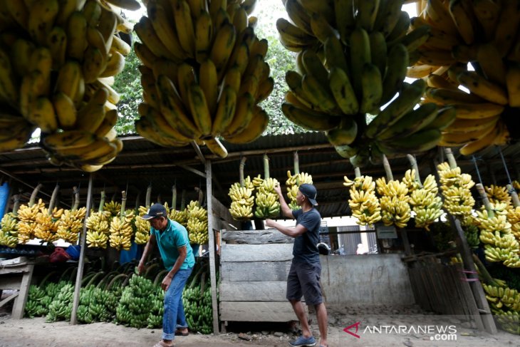 Pedagang menata pisang untuk dijajakan ditengah pandemi COVID-19, di pasar tradisional Lambaro, Aceh Besar, Aceh, Sabtu (3/10 2020). Antara Aceh/Irwansyah Putra.