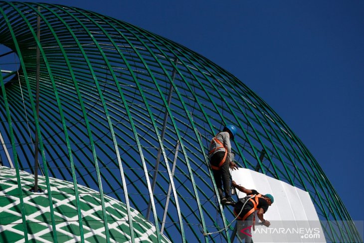 Pekerja membuat konstruksi kubah masjid di Pekan Bada, Aceh Besar, Aceh, Selasa, (20/10/2020). Pandemi COVID-19 dan pemberlakukan berbagai kebijakan terkait pencegahan penularan juga telah berdampak terhadap kontraksi pada sektor konstruksi dan real estat nasional dari 28,77 persen pada Agustus menjadi 19,82 persen pada September 2020 atau minus 48,59 persen. Antara Aceh/Irwansyah Putra.