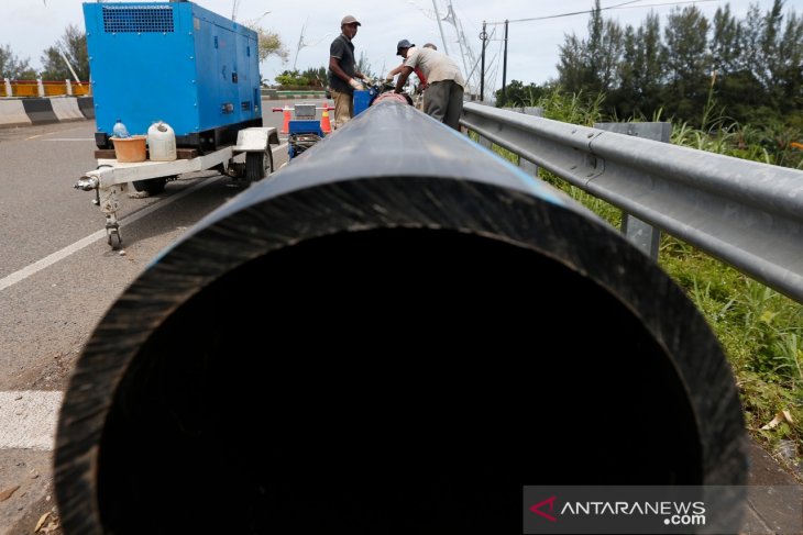 Pekerja merangkai pipa untuk mengalirkan air bersih Perusahaan Daerah Air Minum (PDAM) di Banda Aceh, Aceh, Sabtu (24/10/2020). Pemerintah telah menetapkan target dalam Rencana Pembangunan Jangka Menengah Nasional (RPJMN) 2020-2024 dengan capaian akses air minum layak sebesar 75 persen dengan akses air minum perpipaan sebesar 30 persen. Antara Aceh/Irwansyah Putra.