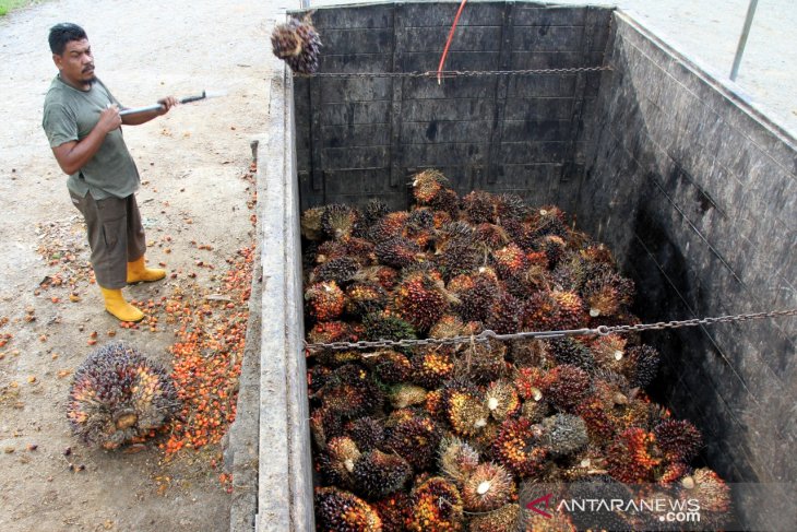 Pekerja memasukkan Tandan Buah Segar (TBS) kelapa sawit ke dalam truk di salah satu tempat penampungan Desa Tumpok Ladang, Kecamatan Kaway XVI, Aceh Barat, Aceh, Rabu (16/12/2020). Gabungan Pengusaha Kelapa Sawit Indonesia (Gapki) mencatat ekspor produk minyak sawit (CPO) dan turunannya pada Oktober 2020 mencapai 3,028 juta ton atau naik 9,5 persen dibandingkan bulan sebelumnya. Antara Aceh/Syifa Yulinnas