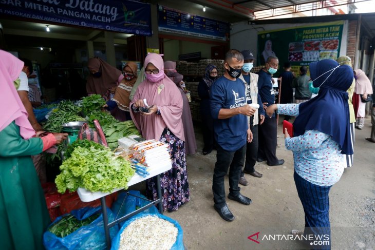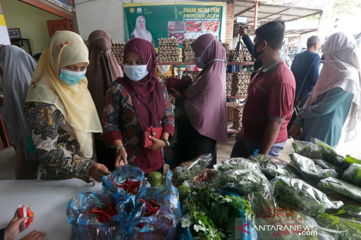 Warga berbelanja sayur dan sembako di pasar murah Mitra Tani yang digelar Pemerintah Provinsi Aceh di Aceh Besar, Aceh, Kamis (17/12/2020). Pasar murah yang digelar Pemerintah menjelang akhir tahun 2020 sebagai upaya membantu masyarakat dan petani ditengah pandemi COVID-19. Antara Aceh/Irwansyah Putra.