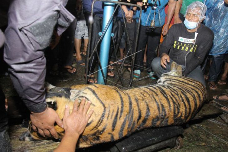 Petugas BKSDA Aceh bersama tim dokter hewan menimbang Harimau Sumatera liar (Panthera tigris sumatrae) saat proses evakuasi di Desa Pangkalan Sulampi, Kecamatan Suro, Kabupaten Aceh Singkil, Aceh, Rabu (23/12/2020). Harimau Sumatera liar yang masuk kedalam perangkap tersebut selanjutnya dibawa ke Conservation Response Units (CRU) Trumon Kabupaten Aceh Selatan untuk observasi lebih lanjut. ANTARA FOTO/Syifa Yulinnas/rwa.