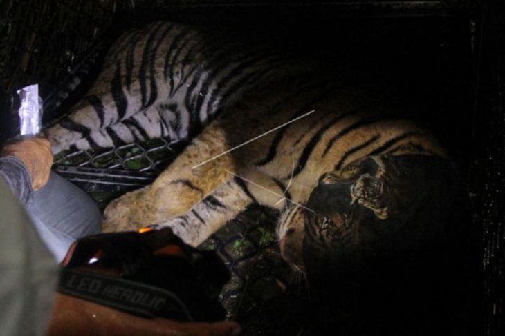 Harimau sumatera liar berada didalam kandang saat proses evakuasi di Desa Pangkalan Sulampi, Kecamatan Suro, Kabupaten Aceh Singkil, Aceh, Rabu (23/12/2020). Pihak BKSDA Aceh mengevakuasi harimau sumatera liar yang masuk kedalam perangkap tersebut ke Conservation Response Units (CRU) Trumon Kabupaten Aceh Selatan untuk observasi lebih lanjut. ANTARA FOTO/Syifa Yulinnas.