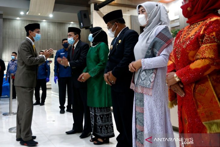 Ketua DPRK Banda Aceh Farid Nyak Umar (kiri) memberikan ucapan selamat kepada Sekretaris Daerah (Sekda) Kota Banda Aceh Amiruddin yang baru di lantik di aula lantai IV kantor Walikota, Banda Aceh, Rabu (30/12/2020). Antara Aceh/Irwansyah Putra