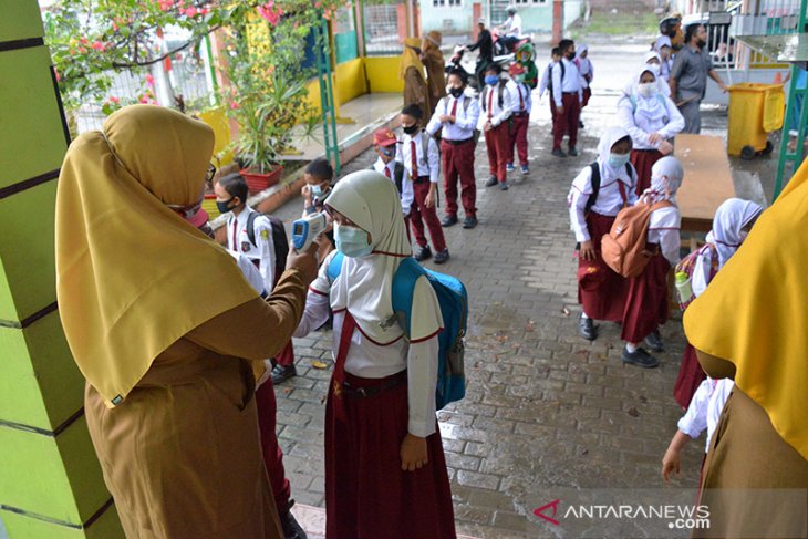 Guru mengecek suhu murid sebelum memasuki ruangan belajar di Sekolah Dasar Negeri 1 Banda Aceh, Aceh, Senin (11/1/2021). Dalam proses belajar mengajar secara tatap muka yang sudah berlangsung di daerah itu, pemerintah Aceh meminta seluruh Bupati dan Walikota melakukan sidak dan pengawasan ketat penerapan disiplin protokol kesehatan di sejumlah sekolah guna mencegah peningkatan kasus COVID-19. Antara Aceh/Ampelsa.