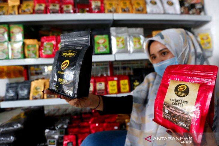 Pekerja memperlihatkan bubuk kopi arabika gayo yang telah dikemas dengan bungkusan hasil kerajinan Usaha Mikro, Kecil dan Menengah (UMKM) rumah tangga dan Industri Kecil Menengah (IKM) di bazar UMK-IKM dan pasar murah Asia Mart Center, Banda Aceh, Aceh, Selasa (19/1/2021). Pemasaran secara mandiri, media sosial dan keterlibatan pihak swasta dengan menggelar bazar atau pasar murah diharapkan dapat membangkitkan kembali perekonomian ditengah pandemi COVID-19. Antara Aceh/Irwansyah Putra.