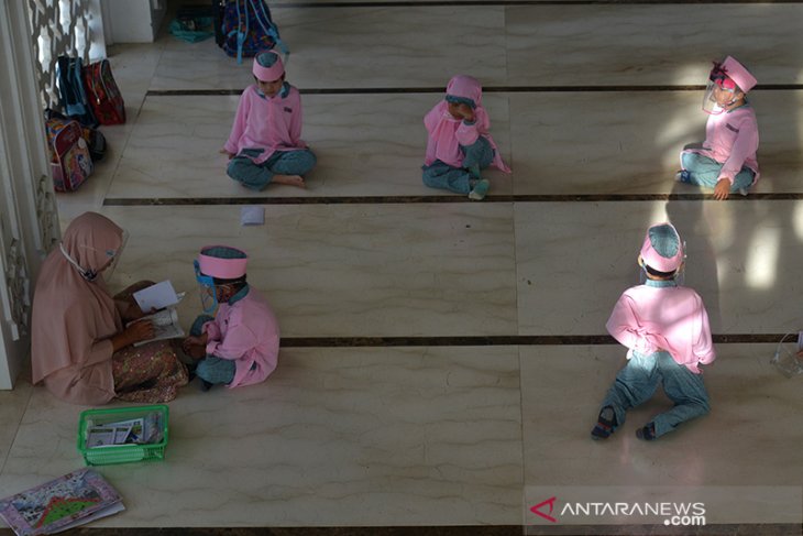 Sejumlah santri mengenakan masker dan menjaga jarak belajar mengaji di Taman Pengajian Alquran (TPA) Masjid Baitussalihin, Desa Ulee Kareung, Banda Aceh, Aceh, Rabu (27/1/2021). Aktivitas belajar mengajar yang diikuti santri dan juga termasuk sekolah Taman Kanak Kanak (TK) di TPA itu menerapkan disiplin protokol kesehatan guna mencegah peningkatan kasus COVID-19. Antara Aceh/Ampelsa.