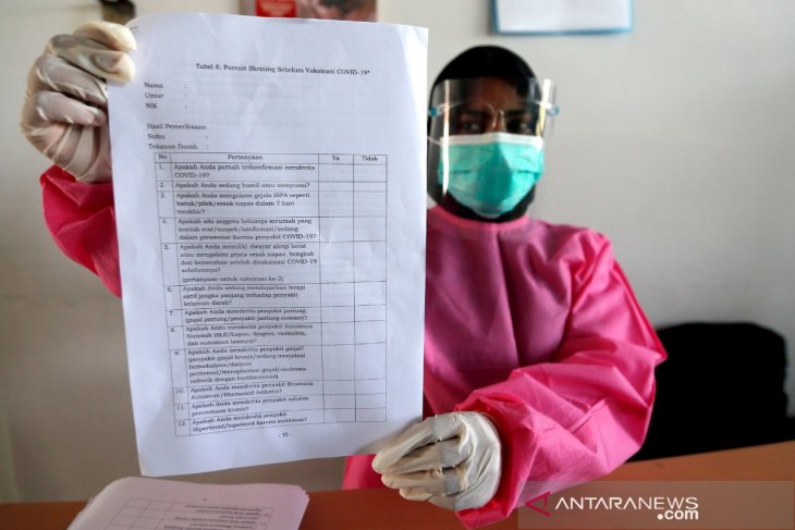 Petugas registrasi memperlihatkan formulir persyaratan untuk mendapatkan vaksinasi COVID-19 Sinovac bagi tenaga kesehatan di Puskesmas Ulee Kareng, Banda Aceh, Aceh, Rabu (27/1/2021). Menteri Kesehatan Budi Gunadi Sadikin menyebutkan terdapat 15 persen dari 1,48 juta tenaga kesehatan tahap pertama belum dapat diberikan vaksinasi COVID-19 karena terkendala tekanan darah tinggi dan memiliki penyakit penyerta (komorbid). Antara Aceh/Irwansyah Putra.