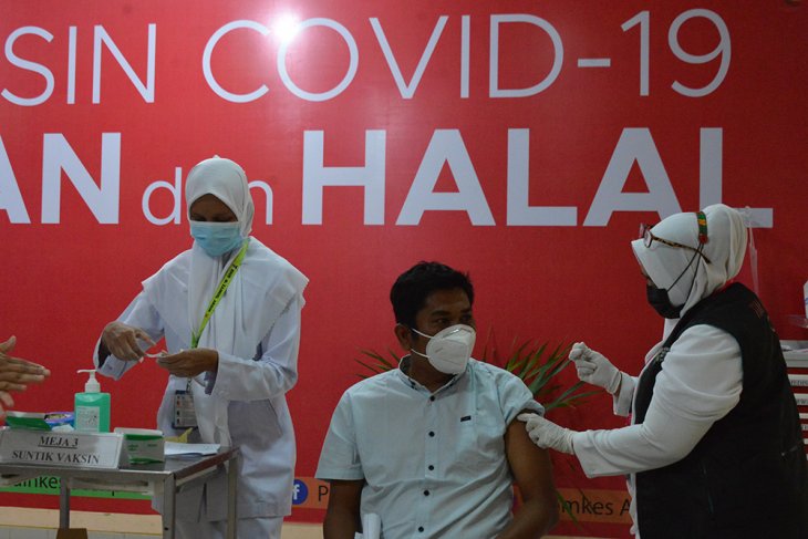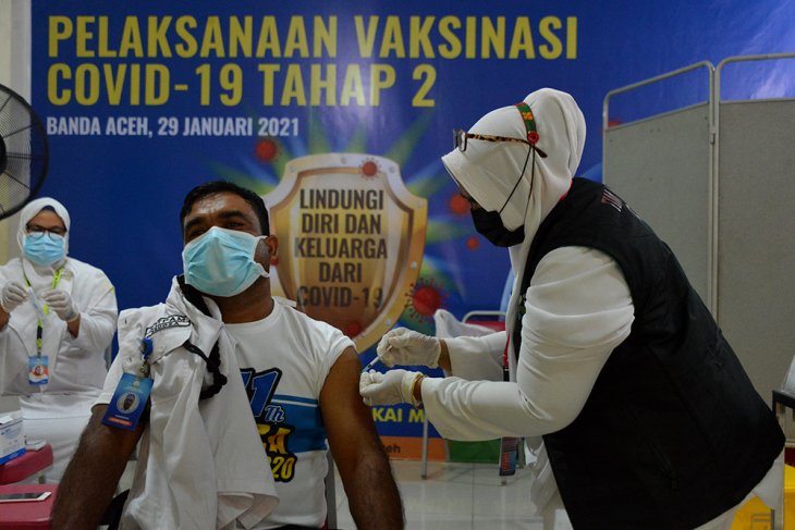 VAKSINASI COVID-19 SINOVAC TAHAN DUA. Petugas menyuntikkan vaksin COVID-19 Sinovac kepada Satpam dan tenaga kesehatan di Rumah Sakit Umum Zainal Abidin, Banda Aceh, Aceh, Selasa (16/2/2021). Hasil pemantauan tim pemerintah Aceh di sejumlah rumah sakit kabupaten/kota di daerah itu, tenaga kesehatan antusias mengikuti vaksinasi dan diharapkan target vaksinasi tahap ke dua pada 28 Februari tercapai serta berjalan sukses dalam upaya mencegah penyebaran COVID-19. Antara Aceh/Ampelsa.