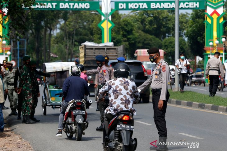 Petugas gabungan dari Satpol PP, TNI dan Polri menggelar operasi yustisi penegakan protokol kesehatan (prokes) COVID-19 di perbatasan kota Banda Aceh dan Kabupaten Aceh Besar, Aceh, Selasa (16/2/2021). Razia dengan sandi ops yustisi protokol kesehatan COVID-19 yang rutin dilaksanakan setiap hari sebagai upaya memperketat pengawasan dan meningkatkan kesadaran warga dalam menerapkan protokol kesehatan . Antara Aceh/Irwansyah Putra