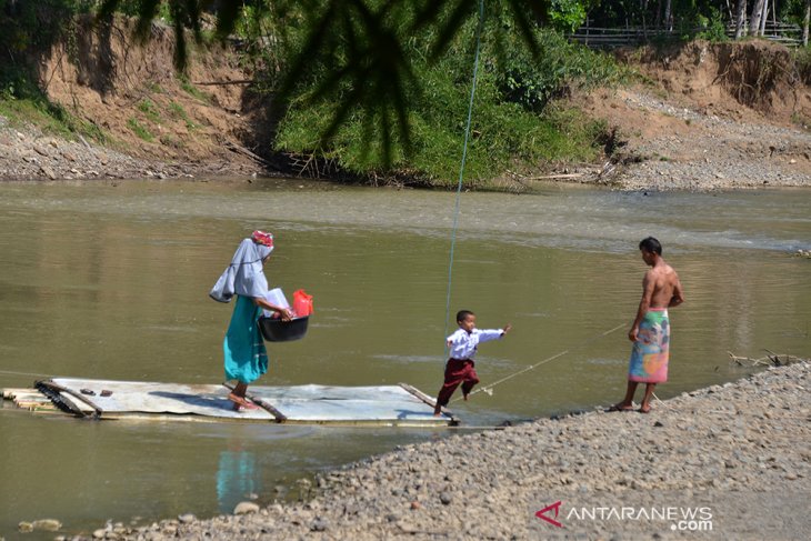 Murid gunakan rakit bambu seberangi sungai di pedalaman Aceh