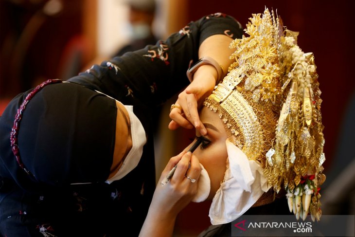 Para model yang memakai kostum adat pengantin daerah dirias wajahnya lomba merias wajah pada rangkaian kegiatan wedding expo di Banda Aceh, Aceh, Minggu (28/2/2021). Lomba merias wajah pengantin dengan pakaian adat diselenggarakan sebagai upaya melestarikan budaya dan adat istiadat serta membangkitkan kembali usaha merias (makeup) pengantin ditengah pandemi COVID-19. Antara Aceh/Irwansyah Putra.